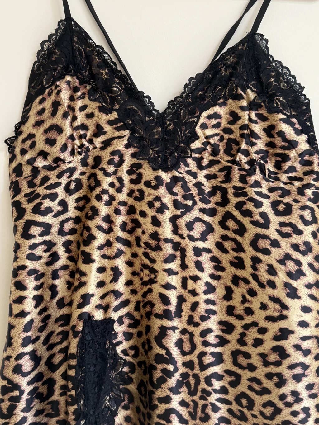 Camison lencero de saten estampado animal print ,con detalle de encaje negro en el escote y la espalda es cruzada