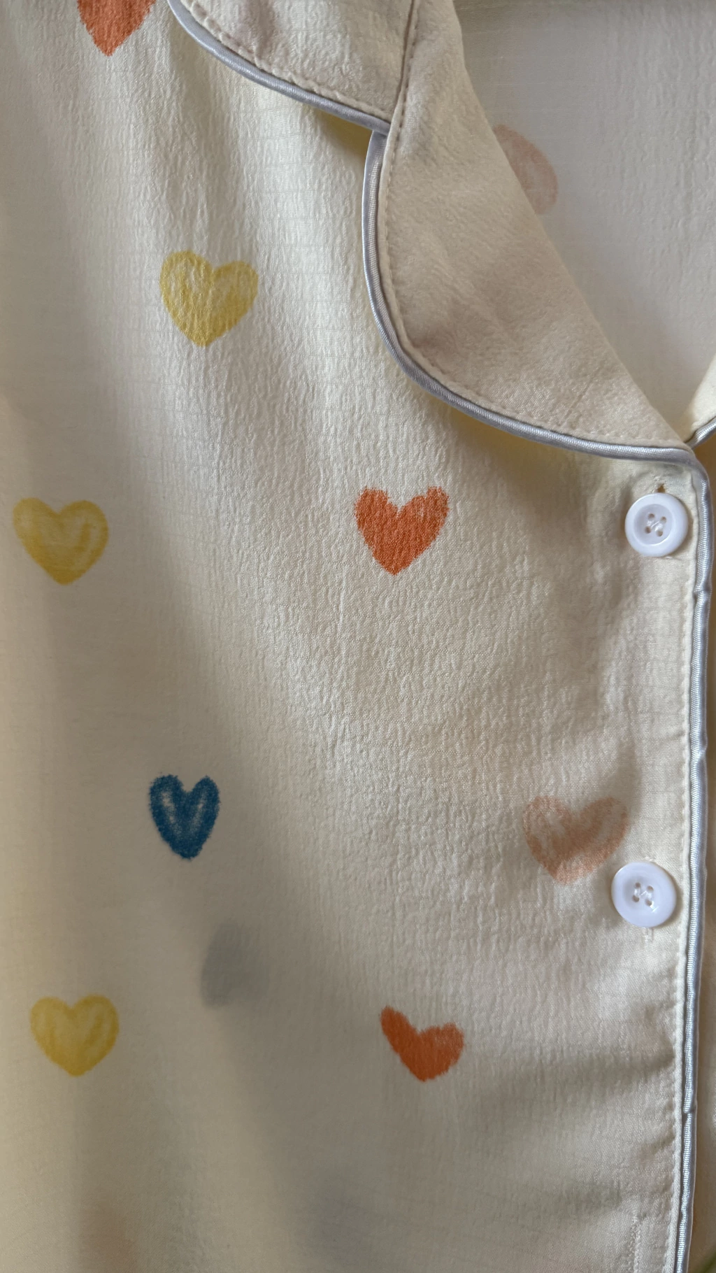 Es de crepe crema con estampa de corazones multicolores en tono pastel