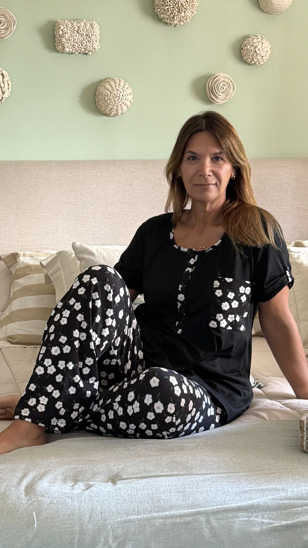 Pijama 2 piezas Talle Grande/Especial o Ropa comoda para estar en casa Negro con estampa de flores
