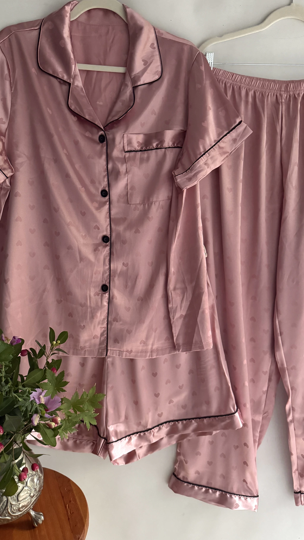 Pijama de saten 3 piezas con estampa de corazones , "Super Romantico "